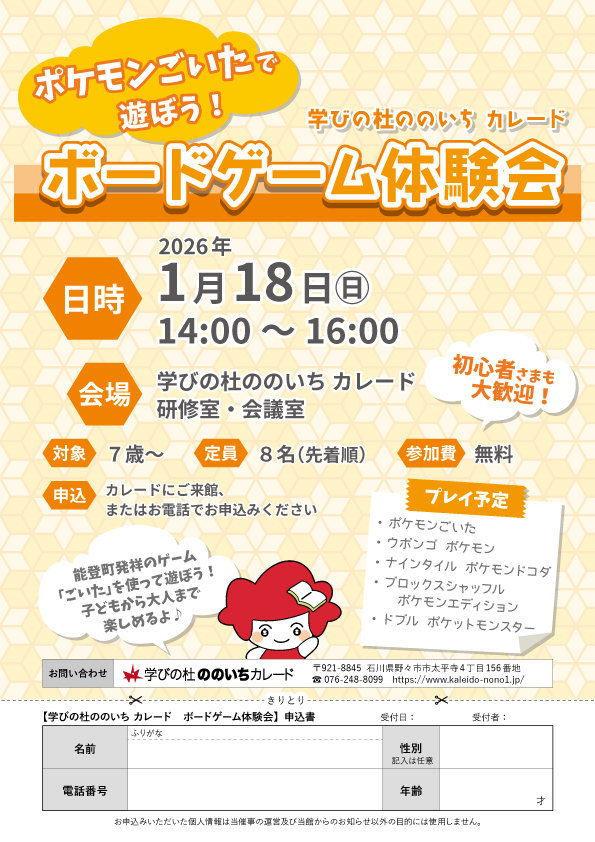 【カレード主催】ごいたで遊ぼう!ボードゲーム体験会 投稿日: 2025年12月16日 カレード 会期:2026年1月18日(日)14:00~16:00会場:学びの杜ののいち カレード 研修室・会議室対象:7歳以上定員:8名(先着順)申込み方法:カレードにご来館、またはお電話でお申し込みください。※参加無料能登町発祥のゲーム「ごいた」を使って遊ぼう!子どもから大人まで楽しめますよ♪ごいた以外にも、さまざまなボードゲームをプレイ予定です。初心者さまも大歓迎ですので、お気軽にご参加ください。 前の記事 次の記事