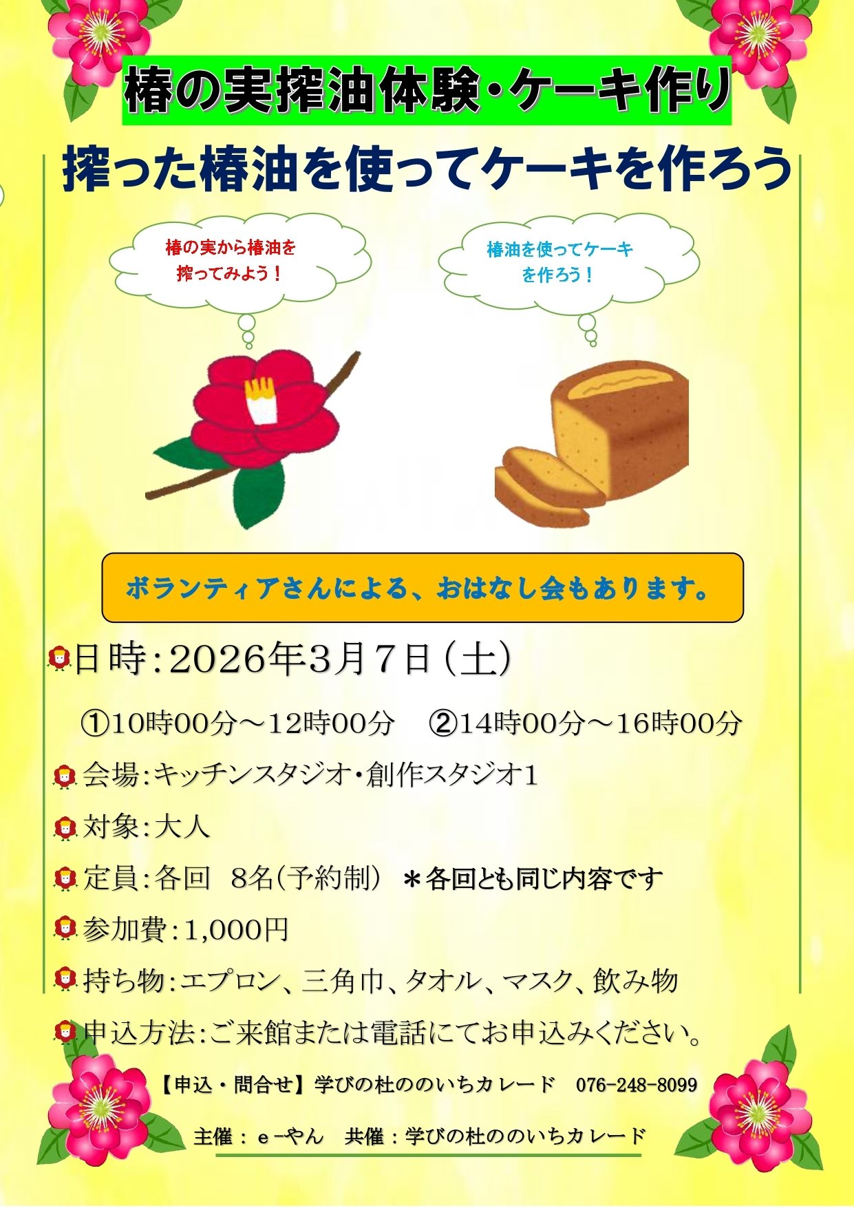 【カレード共催】椿の実搾油体験・ケーキ作り 搾った椿油を使ってケーキを作ろう