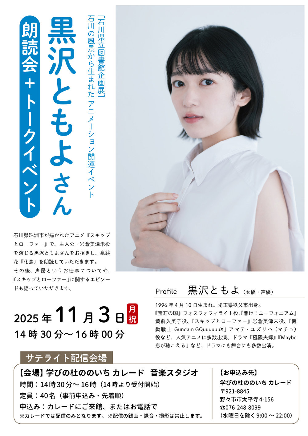 石川県立図書館で行われる『黒沢ともよさん 朗読会+トークイベント』を、カレードでも配信上映します。