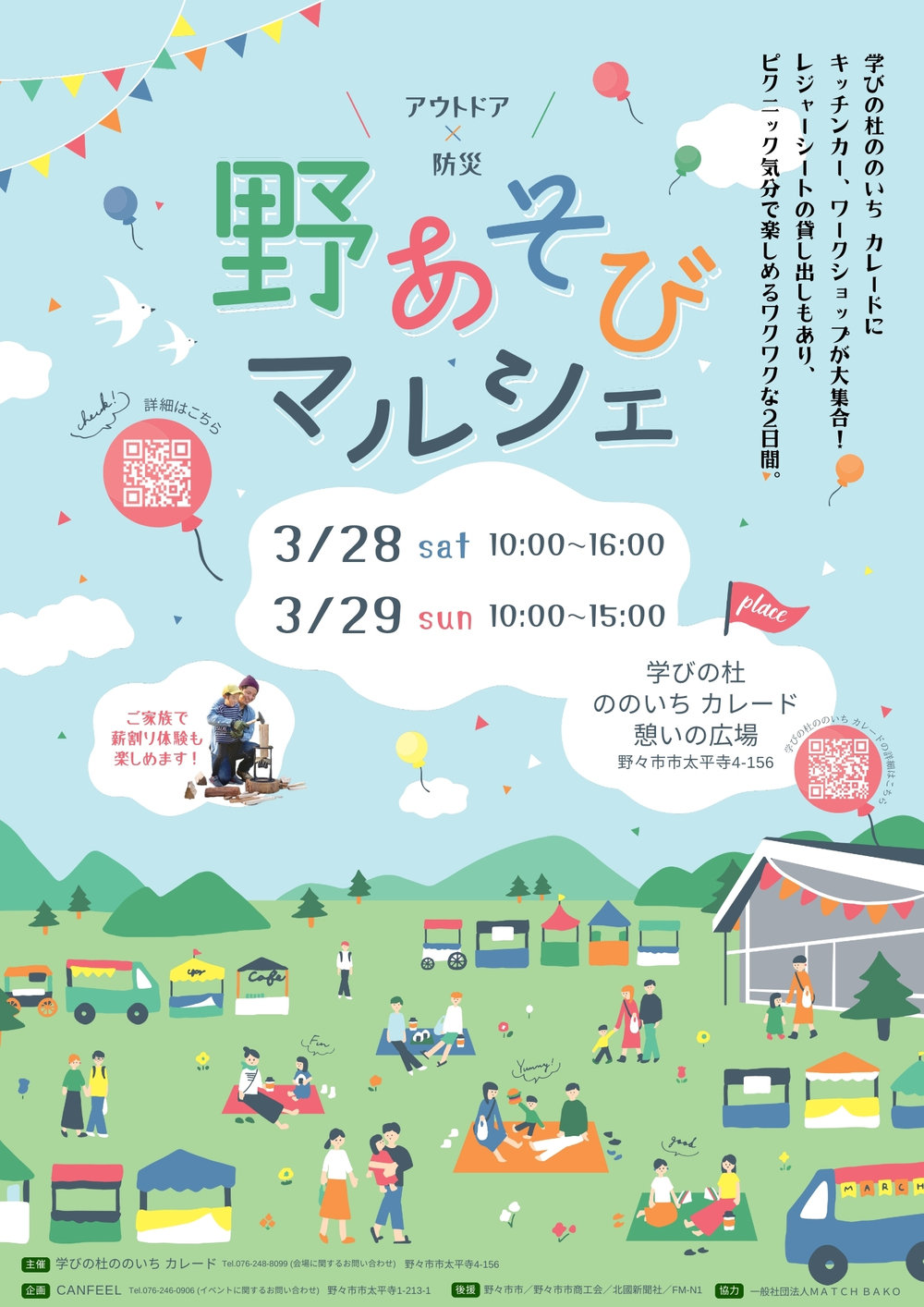 【カレード主催】「野あそびマルシェ2」開催! 投稿日: 2026年3月13日 カレード 【日時】3月28日(土) 10:00~16:00、3月29日(日) 10:00~15:00【会場】学びの杜ののいち カレードカレードに、キッチンカーやワークショップが大集合!レジャーシートの貸し出しもあり、ピクニック気分で楽しめるワクワクな2日間。ぜひご来館ください♪主催・お問い合わせ:学びの杜ののいちカレード TEL. 076-248-8099 前の記事 次の記事
