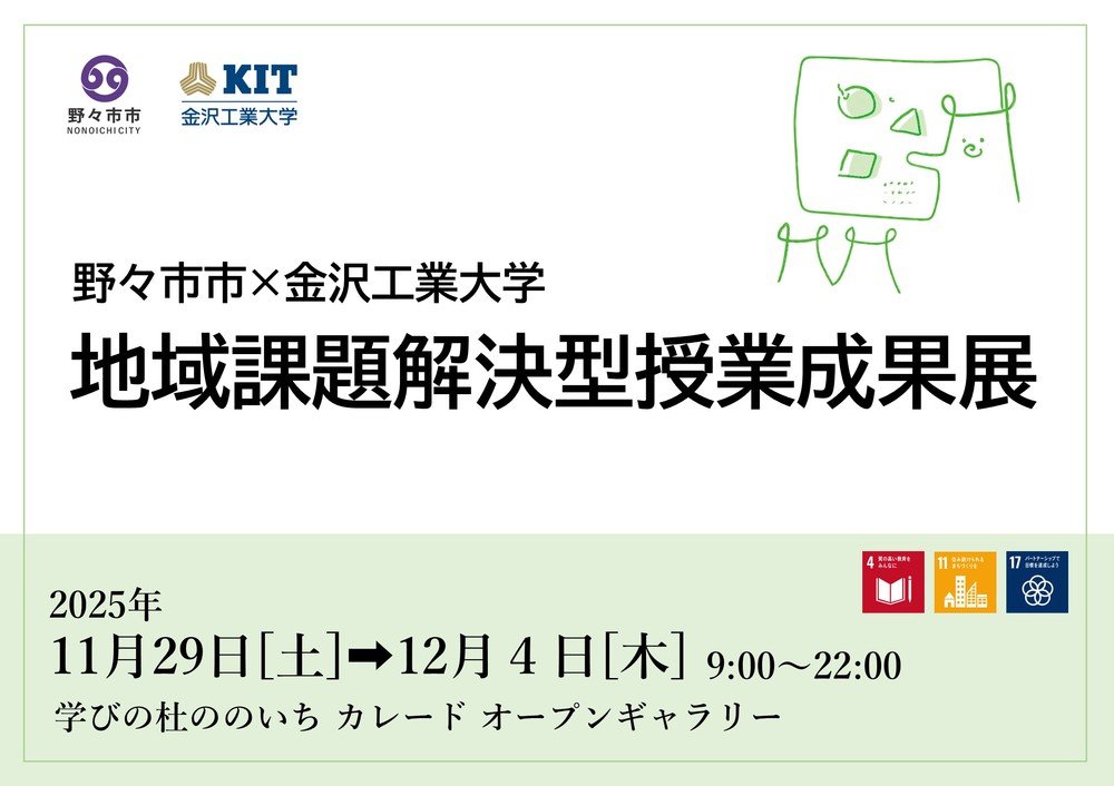 【貸館】野々市市×金沢工業大学 地域課題解決型授業成果展 開催日:2025年11月29日 ~ 2025年12月 4日 ギャラリー 時間 09:00 ~ 22:00 内容 会場 オープンギャラリー 持ち物 入場無料 主催・問い合わせ 野々市市企画財政課 前の記事