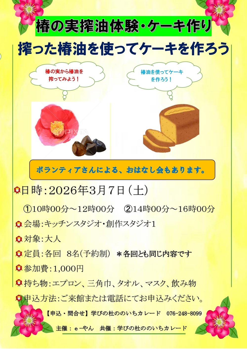 【カレード共催】椿の実搾油体験・ケーキ作り 搾った椿油を使ってケーキを作ろう