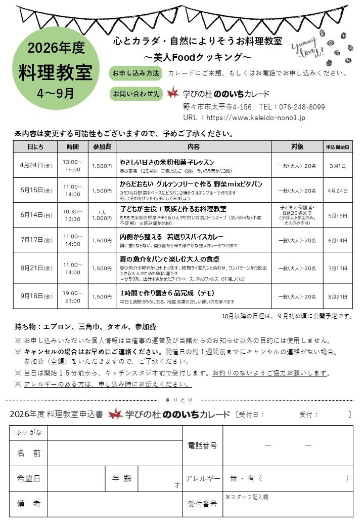2026年4月~9月分の「料理教室」スケジュールが決定いたしました!
