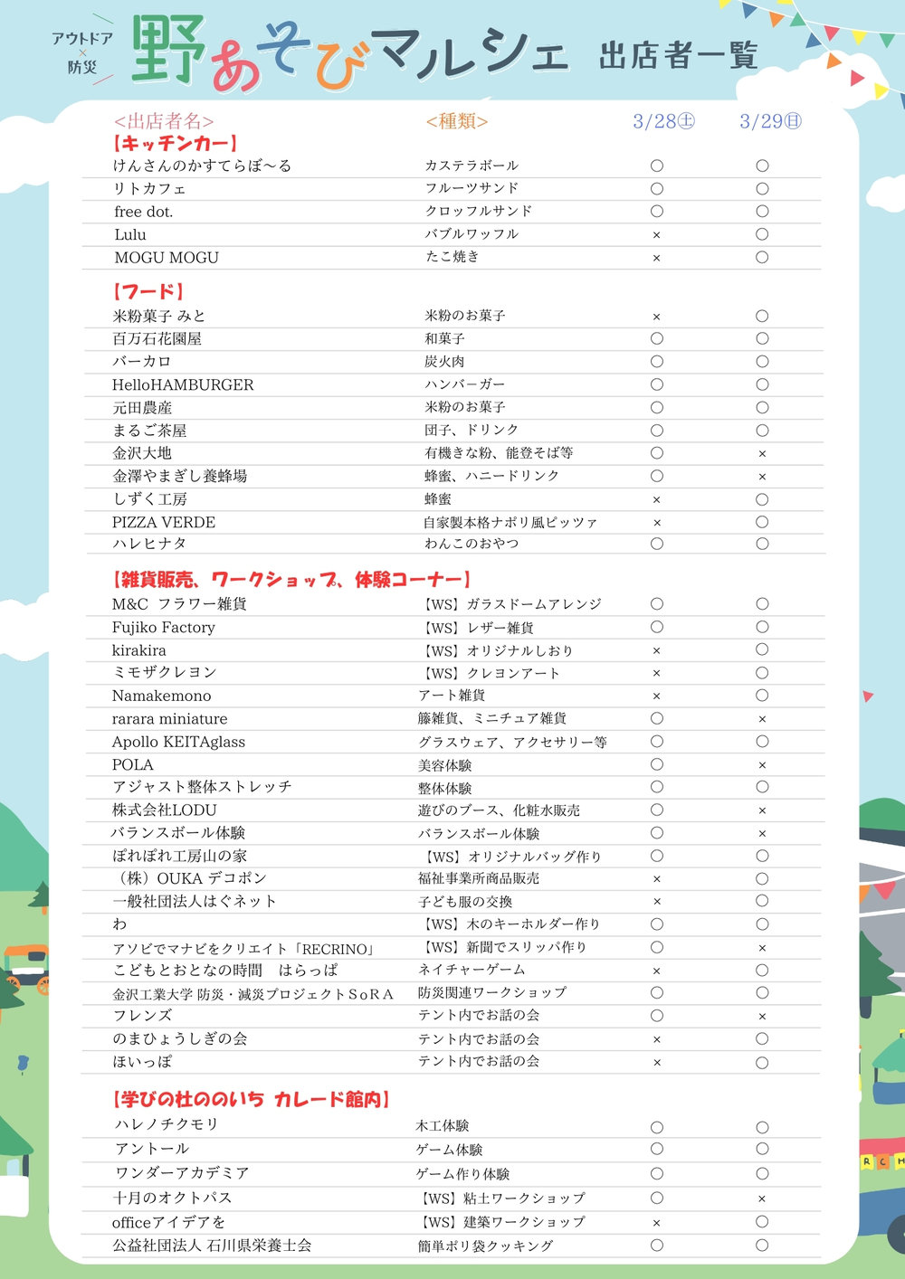 【カレード主催】「野あそびマルシェ2」開催! 投稿日: 2026年3月13日 カレード 【日時】3月28日(土) 10:00~16:00、3月29日(日) 10:00~15:00【会場】学びの杜ののいち カレードカレードに、キッチンカーやワークショップが大集合!レジャーシートの貸し出しもあり、ピクニック気分で楽しめるワクワクな2日間。ぜひご来館ください♪主催・お問い合わせ:学びの杜ののいちカレード TEL. 076-248-8099 前の記事 次の記事